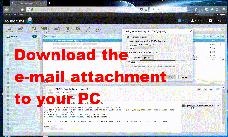 After the e-mail is sent, check your e-mail from your PC and download the attachment to your CS:GO or CS2 cfg folder. You can find your cfg folder by browsing local files from the properties of Counter-Strike GO or 2 in your Steam library.